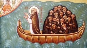 Entonces el santo padre y los suyos se vieron arrastrados de aquí para allá por las aguas del océano durante tres meses. No veían nada más que el cielo y el mar. Comían solo cada dos o tres días.